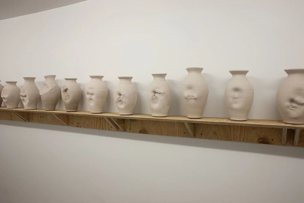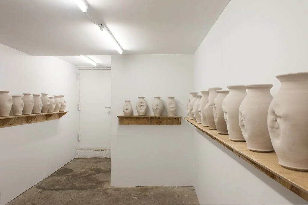 "Face Vase" is an ongoing project that consists of an accumulation of wheel thrown vases which receive a facial impression while the clay is still soft. The vases are then placed on shelves and left to dry for the duration of the show. For the exhibition at NOVELLA, the artists have lined the perimeter of the gallery with a long non-contiguous shelf.