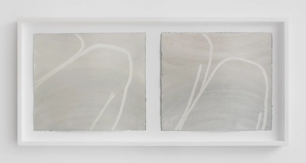 Elrod makes many drawings in ink on paper and these often inspire larger paintings. These luminous works have a light-blasted quality; thinly painted surfaces subtly suggest edges, layers, and the spaces in between. Paint has been added but also intentionally rubbed out, creating form through removal. This subtraction, along with the addition of drawing in pastel has become an increasingly important aspect of the artist’s process.