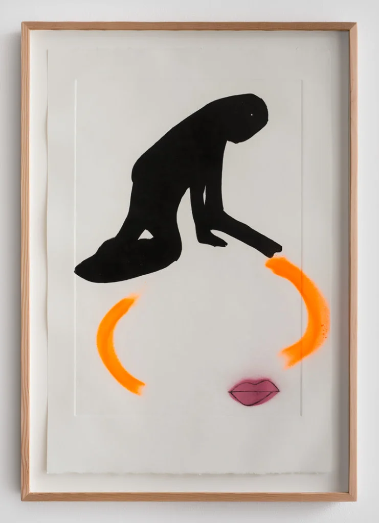 So: one hand gives an other’s a radiant loop or tangle of orange lasso; in the second piece, a figure crawls in black over strange lips (Beckett’s “Not I”?). In the first of the two, “Repetitious Actions,” there’s a weft, a bright mess, handed from one to the next. The relation a gift or exchange forms between two unseen people, and the beautiful bright mess of color are its two subjects. What’s being handed—what’s always at hand?—is orange, pure and simple. A coiled braided mess of it. In waking life it’s maybe cord or rope, but in art (life’s only twin), it’s just color. In the other, a figure crawls or atones. Is it of or in a head, as memory? If so it’s likewise not. The place-holders that float over the lips seem designed to to hold a heavy silence. And yet there is a real buzz to the relations, the way the three elements are of a piece. They form a knot, afloat in a void, and seem suddenly aware of one another, as constituents. The lips even seem to find this abrupt relationship amusing, but maybe that’s a stretch. These two pieces are worth looking at for a very long time. They get better and better the longer I do so. And although it’s impossible to say any of J’s work is “representative,” that’s one of his greatest strengths as an artist, and he has many. The one trait or metonym (too loose a mesh to use) that in some way points to the work as a whole is their resemblence to cave paintings. Our earliest ancestors, from Malaysia to the French Alps, used loose but succinct iconographies, as simple as handprints or as multifarious as herds of buffalo spread across the mud walls of their chambers and fire-halls. Likewise, J (and plenty of other ‘modern’ artists—Haring, Bourgeois, or DeKooning, for example) use combinations of minimal elements to get the point across. They holed up in those spaces to dream or reconfigure the scene (seen)—the ‘real’ or waking world, and those dreams suddenly stayed put. Just fast strokes of pigment on big blank walls; they’re still there.