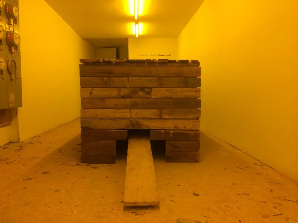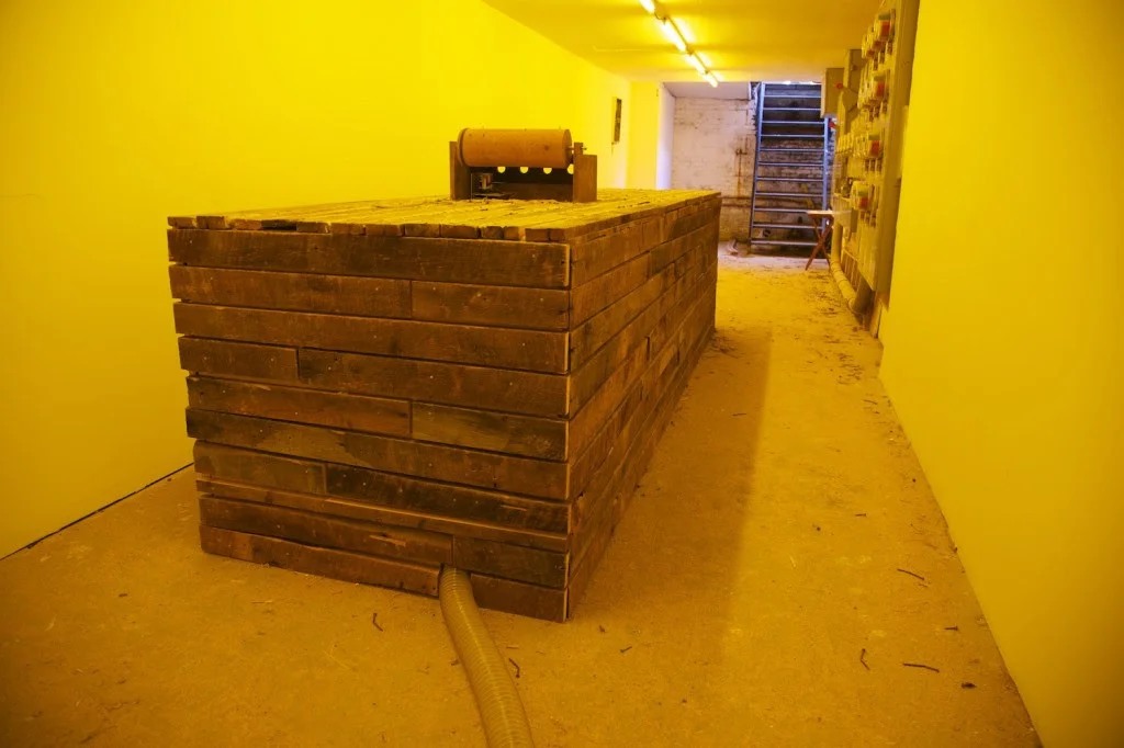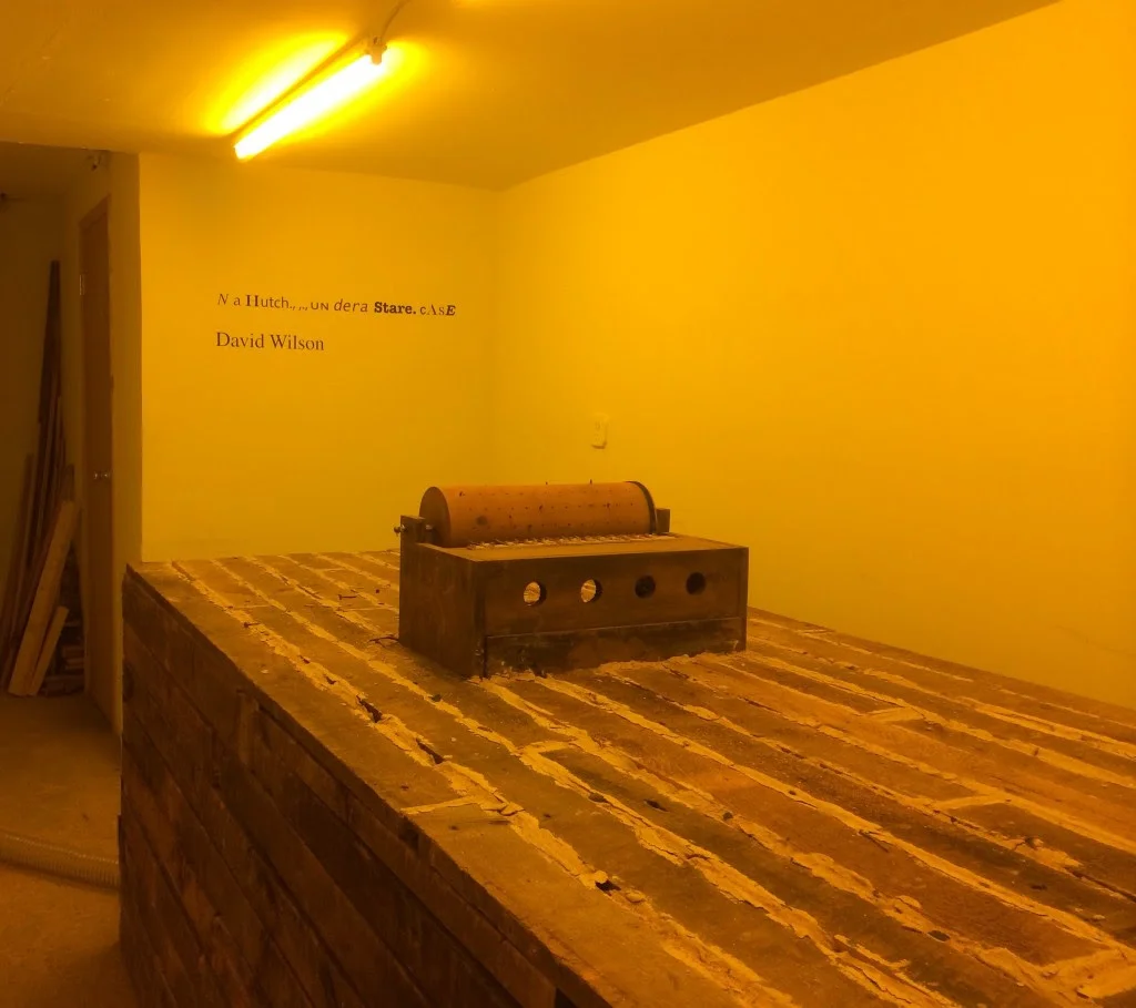 With N a Hutch.,.,., un dera Stare. cAsE, Wilson has researched the history of the street, buildings and neighborhood, where the gallery is located and sourced lumber and metals that were produced and used over a 135 year span of time. The wood comes from both a former tenement building and an upstate New York 19th century barn that supplied goods to the area.