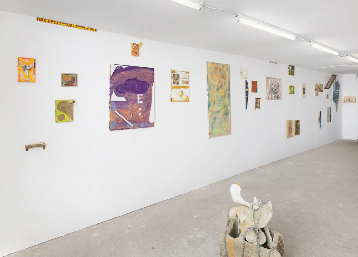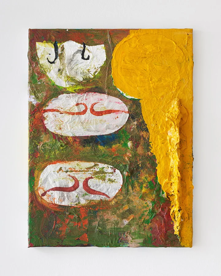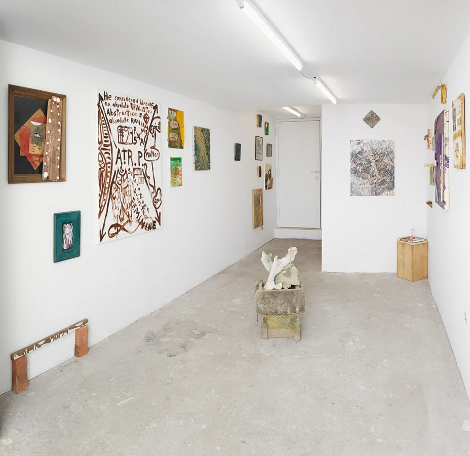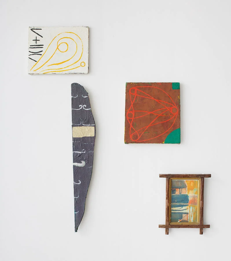 "Rusted Giacometti", a title culled from the surface of one of Peter’s text paintings, spans three decades of exploration, from Peter’s early collages and painting of the 1980’s, which mark his language-heavy digestion of Native American symbolism, and the mythic ethos of Jan Mueller and Marsden Hartley, through his time spent in Williamsburg in the mid 80’s to early 90’s in close dialogue with such painter brethren as Kathy Bradford, Chris Martin, Rick Briggs and Bill Jensen, sharing in their mutual fascination with the paintings of Forrest Bess. Then, the work follows Peter into the woods, through his move upstate, where he continues to practice, witness to babbling brooks, nature’s uninterrupted cycles, and the occasional gnome sighting.